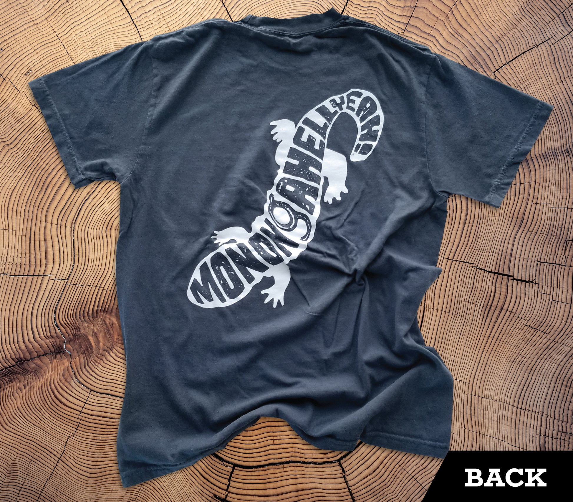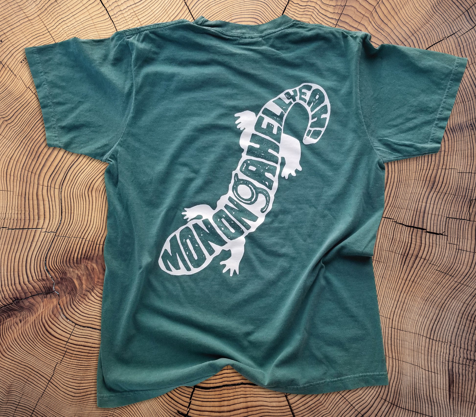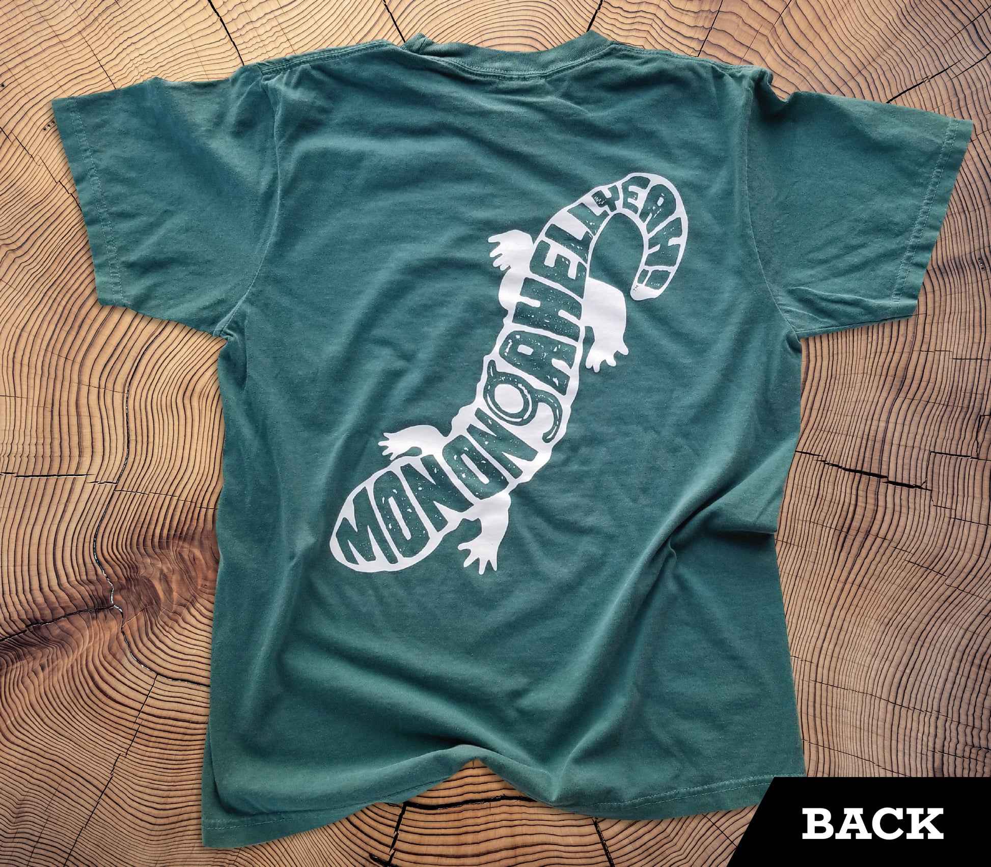 The front features two-color "My Handy Map of WV" graphic on the left breast. The back features the large Monongahellyeah! Hellbender in white.